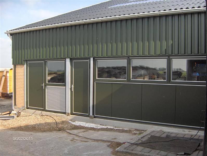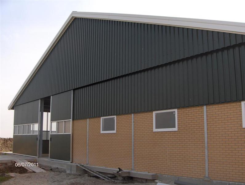 Bovenbouw: thermisch verzinkte spanten, prefab beton binnen- en buitenwanden, vurenhouten gordingen, damwand topgevels en Eternit golfplatendak met standaard open nok.