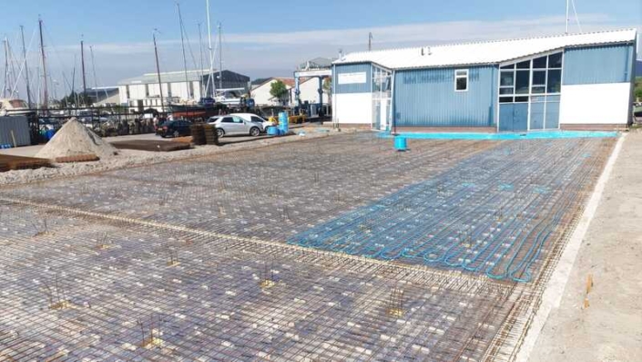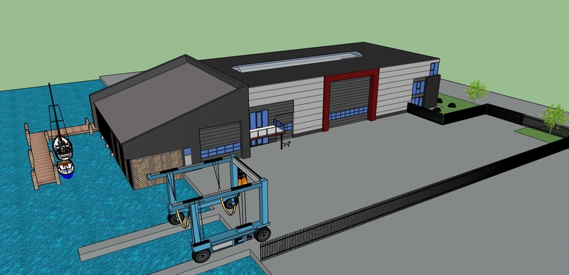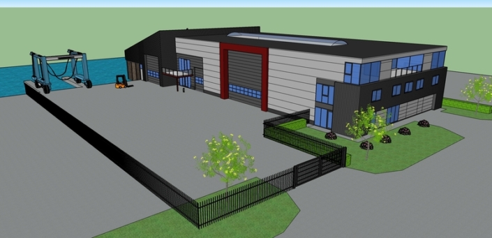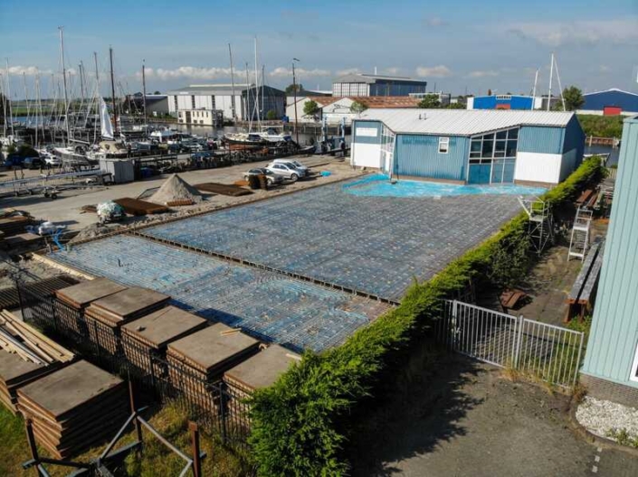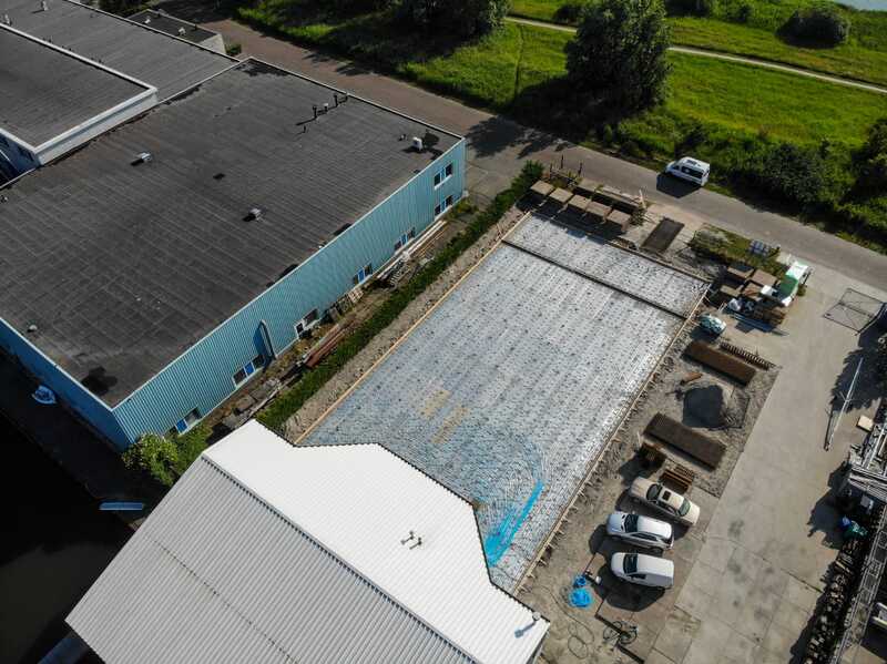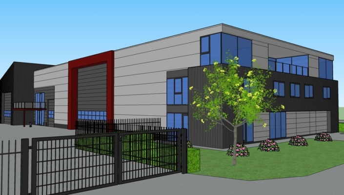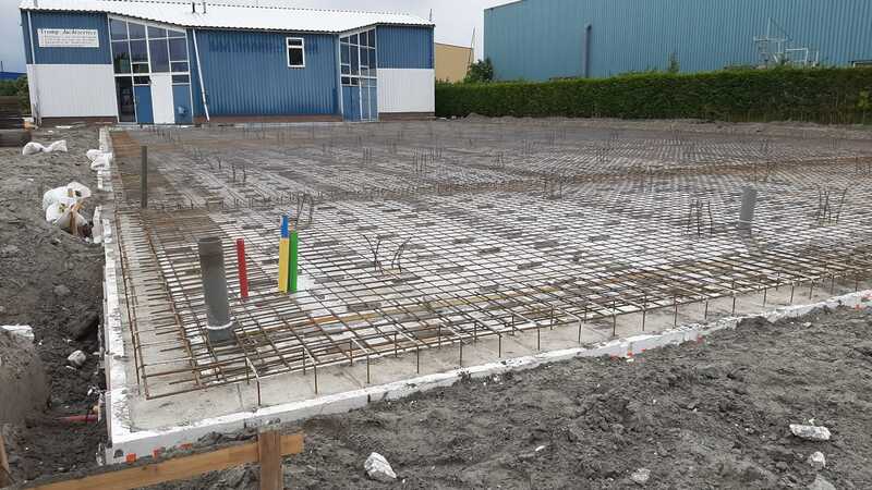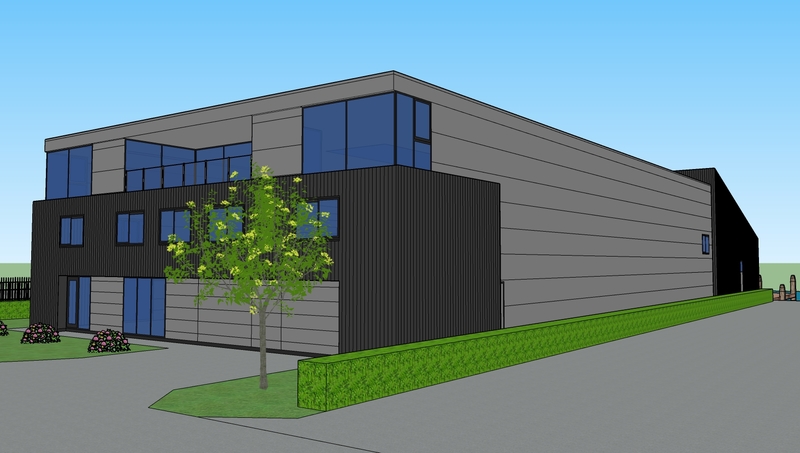 April 2020 zal worden opgestart met de nieuwbouw van een grote bedrijfsloods met inpandige woning. Daarnaast wordt de bestaande bedrijfsloods gerenoveerd en van een nieuwe jas voorzien zodat alles 1 passend geheel wordt. Onderbouw middels betonfundering en vloeren geheel onderheid. Bovenbouw staalconstructie met 2 laag kanaalplaatvloeren in het 1e spantvak ( tbv kantoor- garage en 2 lagen woonruimte.)  Rondom een prefab betonplint met donkere steensplit. Daarboven verticaal sandwichpaneel plankprofiel kleur antraciet. ( de woning en de bestaande loods ) De nieuwe loods daar tussen in wordt voorzien van horizontale EV sandwichpanelen kleur lichtgrijs ( alles 100 mm dik Rc 4.5)  De woonruimte wordt aan binnenzijde nog eens voorzien van HSB wanden zodat deze naar een Rc van 8.0 gaat. Overheaddeuren en kaders liggen verdiept in kleur Antra metallic. Kozijnen van kunststof ook in donkergrijs antraciet met HR +++ glas. De bedrijfskleuren (donkerrood) komen terug in een kader om de grote overheaddeur en in het dakterras ( kantine = boven )