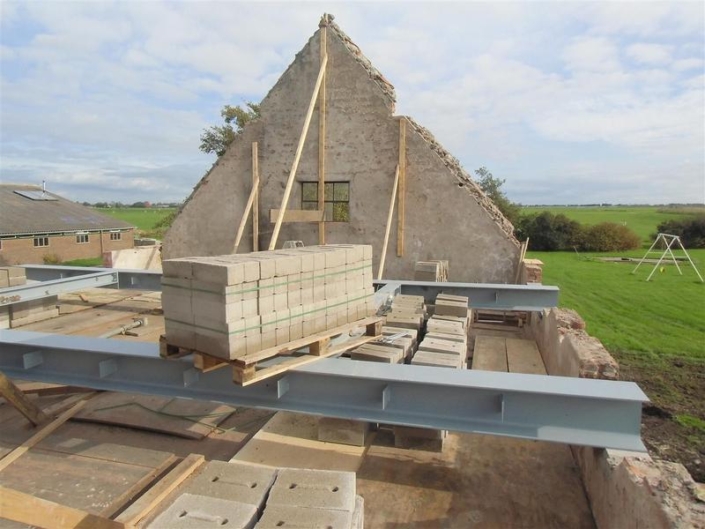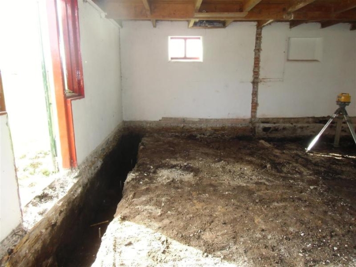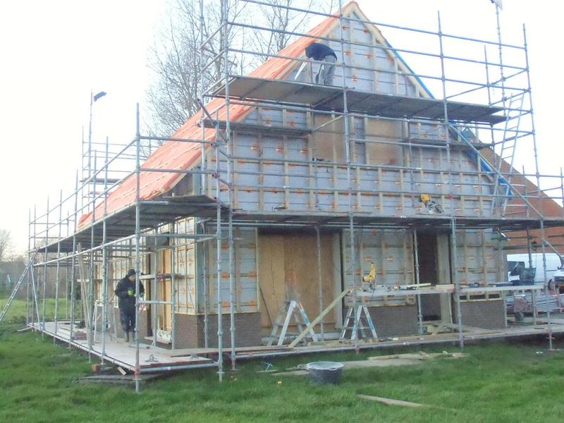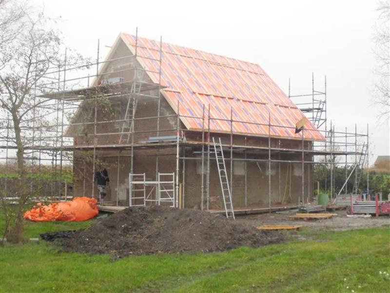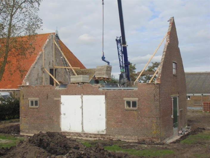 Boersma Balk heeft inmiddels de bestaande betonnen grupvloer van binnen uit gesloopt en stalen buispalen aangebracht. Tevens graaft Boersma Balk alles uit tot de gewenste diepte. Bouwbedrijf Zeilstra gaat volgende week verder met de fundering + geïsoleerde betonvloer. Daarna wordt er een nieuwe houten verdiepingsvloer geplaatst (ruim een halve meter hoger dan de bestaande) Zodra deze vloer er in zit, wordt de kap met riet en pannen geheel verwijderd. Rondom zal het knieschot hoger worden opgemetseld voor meer hoogte op de verdieping. Volgende stap is de nieuwe geisoleerde scharnierkap er op en bedekken met de bestaande oude rode pannen. Zodra dit constructieve werk is gedaan gaan we de oude steens muren een nieuwe indeling geven. M.a.w. betonramen + schuifdeuren er uit en nieuwe kunststof ramen en schuifpuien van Jansma Burdaard er in. Als laatste onderdeel komt de nieuwe schil er om heen : Borstwering van rood/bruin-genuanceerde kbaksteen met daarboven een geisoleerde HSB -wand. Als eindafwerking worden rondom alle gevels bekleed met horizontale houten delen ; Zweeds rabat, fijn bezaagde planken, in een naturel; lichtbruin-grijze kleur.