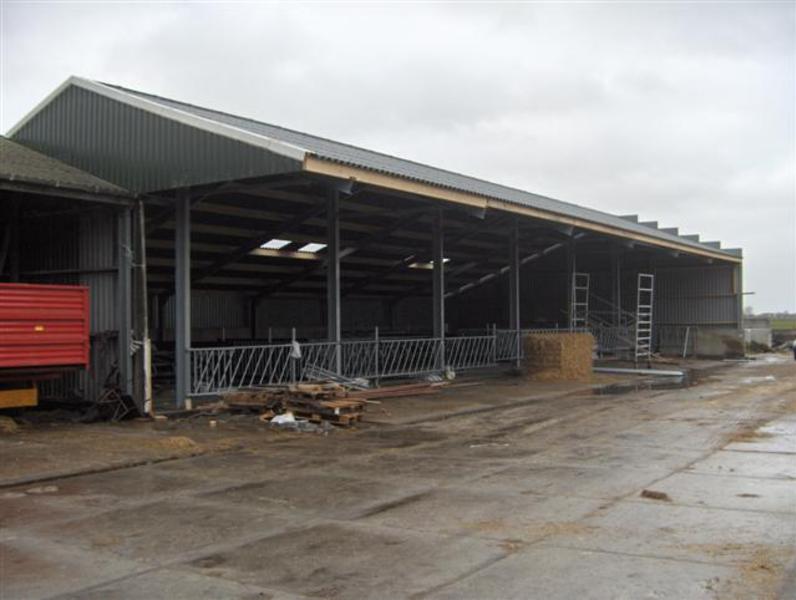 Bovenbouw : Als bouwpakket aangeleverd en te monteren door opdrachtgever. Staalconstructie thermisch verzinkt met houten gordingen en Eternit golfplaten.
