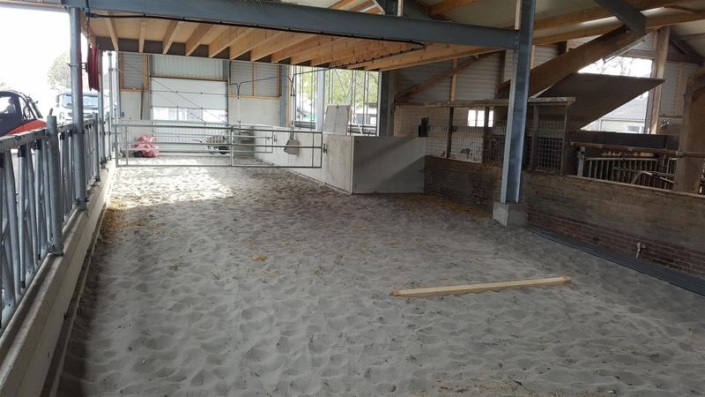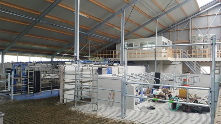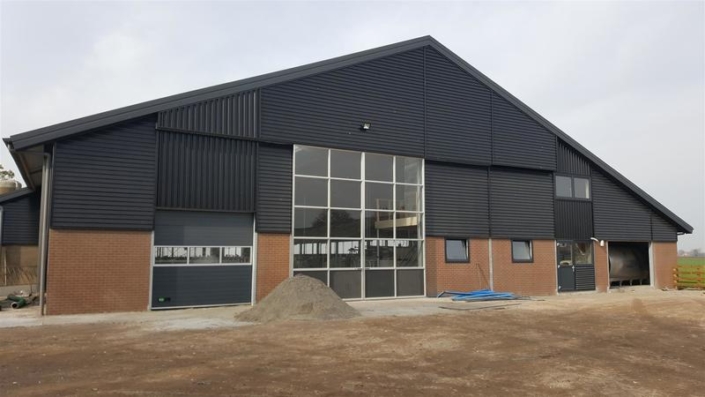 De stal is op het achtererf gebouwd met een aansluiting tegen de zijkant van de bestaande jongveestal. Deze is tegelijk mee gerenoveerd zodat het totaal gebouw 1 fraai uiterlijk krijgt. De stal meet ca 28.5*63.5 m. Incl. alle nodige technische ruimtes biedt de stal ruimte aan ca 160 stuks melkvee en droge koeien. Welkwinning d.m.v. een Rapid exit melkstal 2×12 van deLaval. Hiernaast zijn er een aparte ruimtes / strohokken voor te separeren zorgdieren en afkalven. Voor de droge koeien is er een aparte extra ruimte ( 120 m2) strobox + afkalfstal op zand. Routing in de stal is geheel geoptimaliseerd. De stal heeft aan de voorzijde een schone looproute die in verbinding staat met de jongveestal. Aan de achterzijde van de bestaande jongveestal komt ook een doorbraak zodat de vaarzen heel eenvoudig bij de droge koeien kunnen worden geplaatst. Ruime strozolder boven strohok. Een ruime zolder aan voorgevel voorzien van kantoor met ramen rondom. Daarnaast nog ruimte voor watervaten en pallets boxstrooisel.
