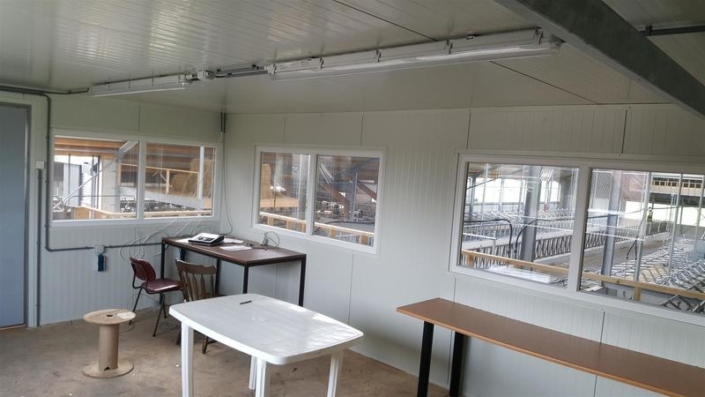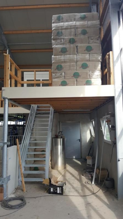 Onderbouw van gestorte mestkelders, slalomsysteem met standaard mixputten. Standaard rooster als loopvloeren ( mag & kan i.v.m. de luchtwasser !) , prefab boxdekken. Thermisch verzinkte spanten. Rondom prefab betonpanelen met metselwerkmotief. Dak van sandwichpaneel TR. In het dak een dichte lichtnok ( ivm luchtwasser) a 3 m1 breed. Kopgevels van zwartpotdekselprofielplaat afgewisseld met verticaal damwand voor een fraai esthetisch geheel. Ventilatie zijgevel van “safe-system” vouwgordijn van Aikoe. Het dak en de gevels van de bestaande jongveestal wordt tegelijk aangepakt. Asbest er af en sandwich er op. Op de jongveestal wel een licht- ventilatienok in dezelfde stijl als de nieuwe stal.