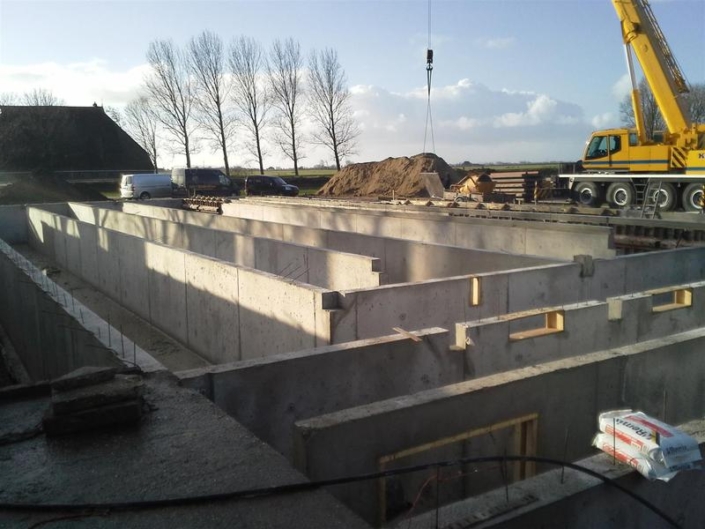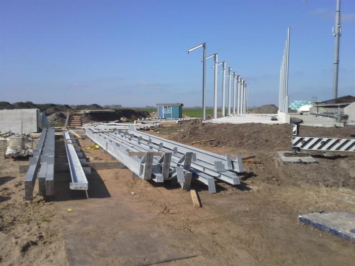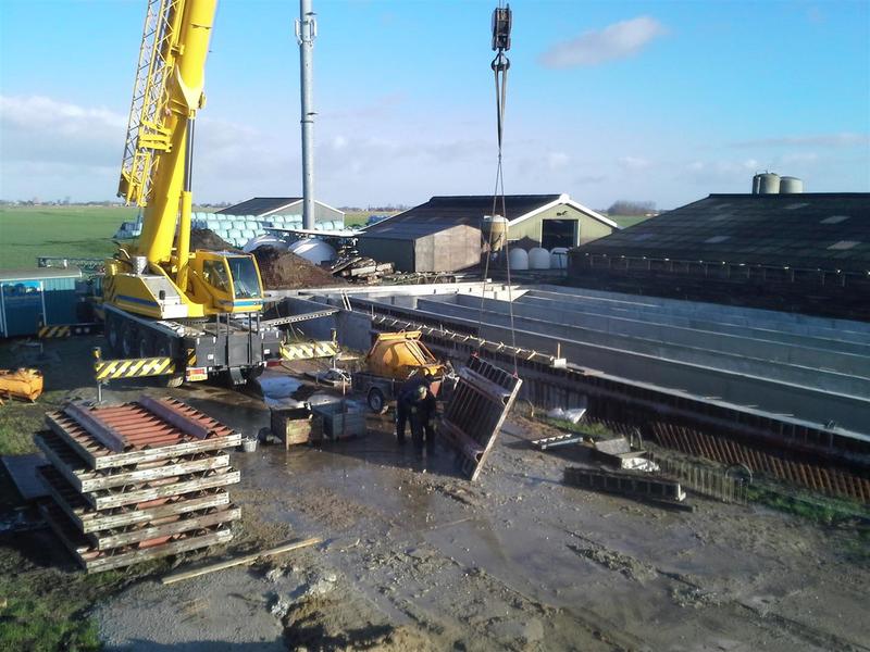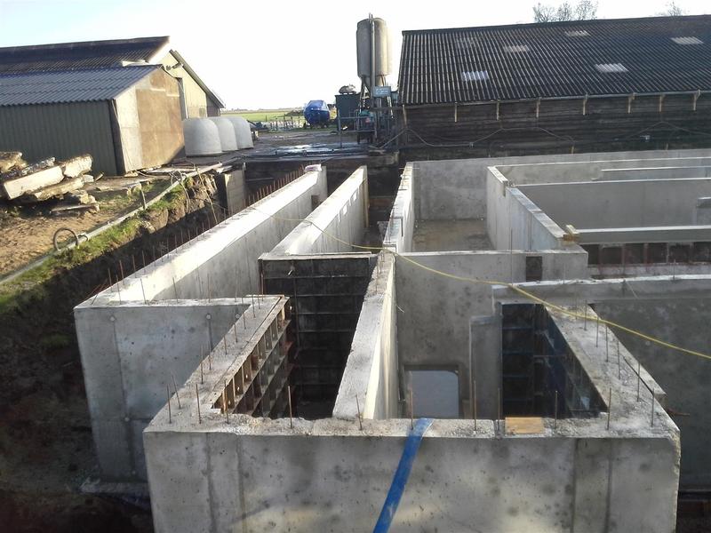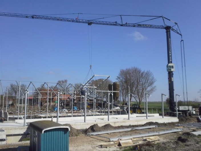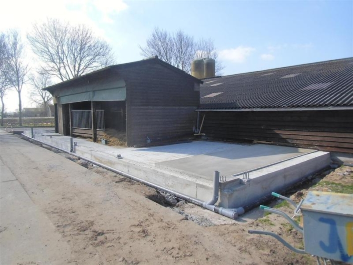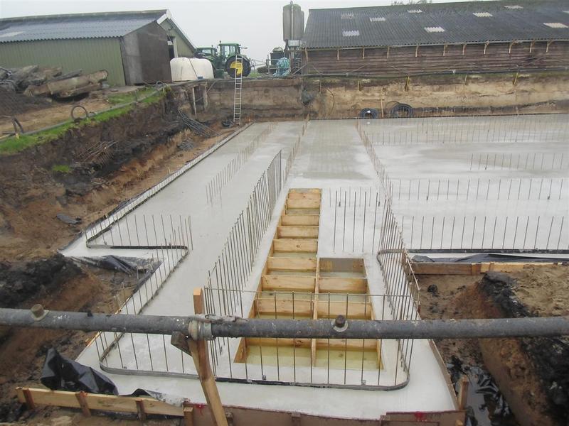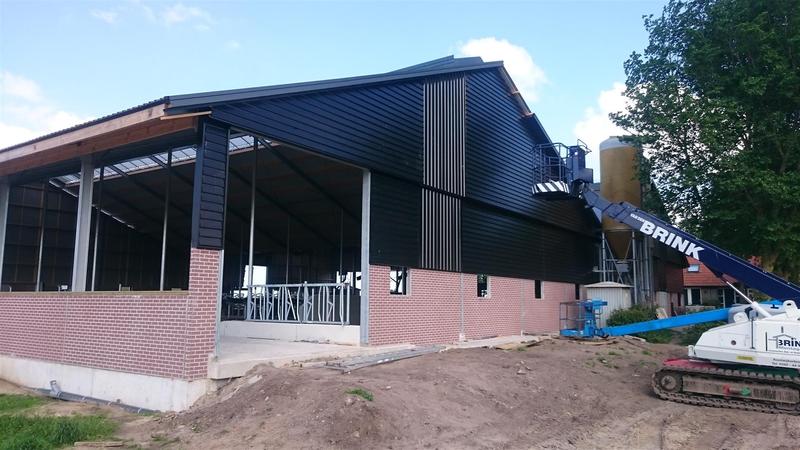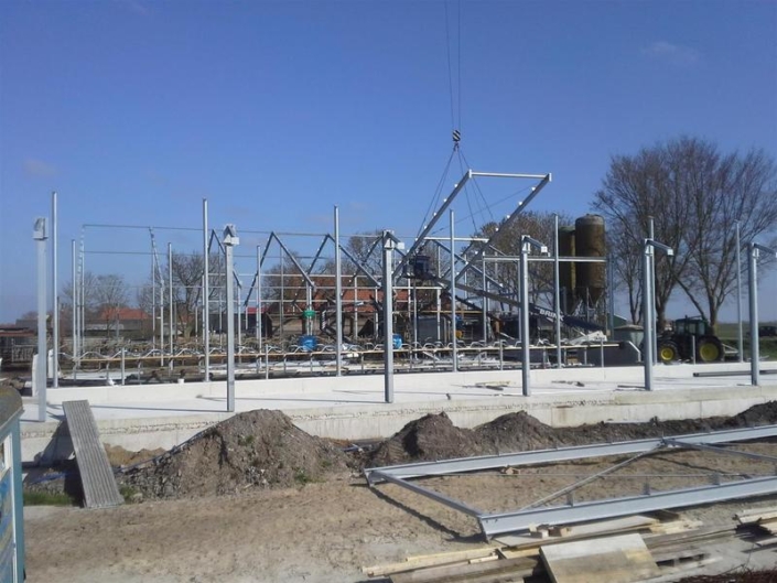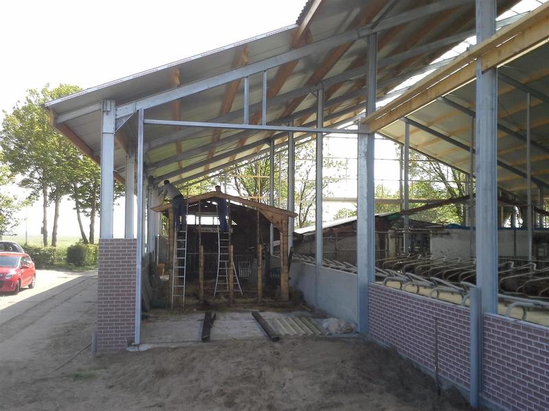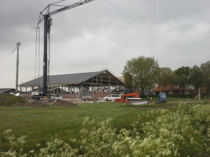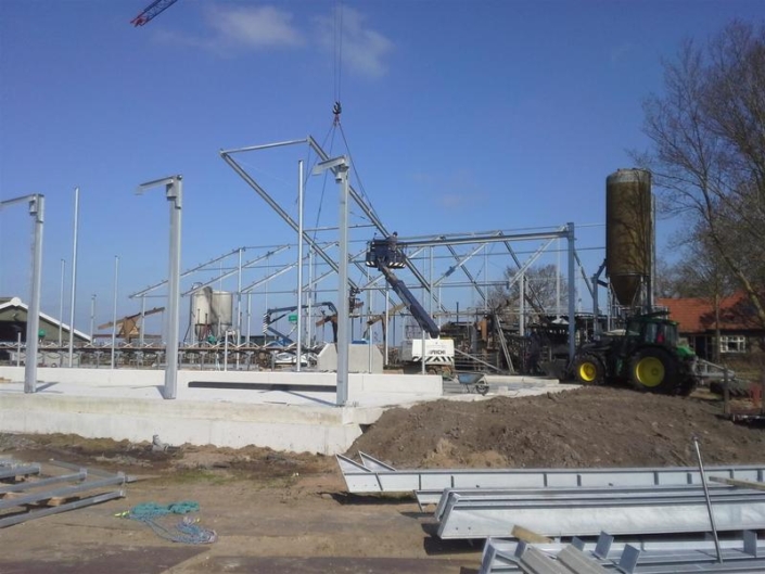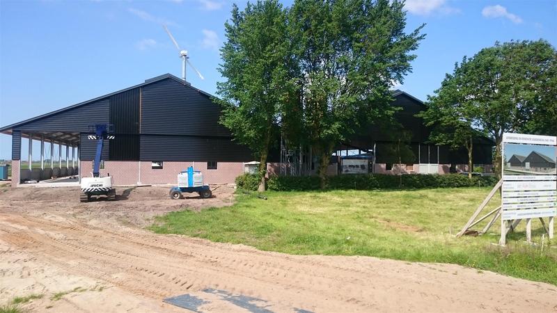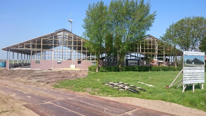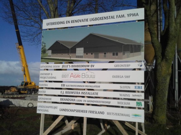 Jelles Bouwbedriuw te Greonterp is aan de Rige te Oudega SWF opgestart met een ligboxenstal verbreding ( 90 extra ligplaatsen) Daarnaast zal de bestaande bovenbouw compleet worden vervangen. Het ligt in de planning om de onderbouw van de uitbreiding eind dit jaar gereed te hebben en medio april 2015 op te starten met de vervanging en uitbreiding van bovenbouw. De nieuwe onderbouw wordt volledig onderkelderd (2m1 diep) Er worden loop- sleuvenvloeren toegepast van Swaans. De in het werk gestorte voergang ligt aan de zijgevel. Aan de andere zijde van de bestaande stal komt een nieuwe ziekenboeg en afkalfstal op stro. Tevens worden de technische ruimtes gemoderniseerd + een kantoor gerealiseerd. Deze ruimtes worden compleet voorzien van een constructieve strozolder welke aan de voorgevel kan worden gevuld. De bovenbouw bestaat uit 2 symmetrische stallen met in de midden een krimpgoot. Op beide nokken een licht-ventilatienok. Goten op 4.5 m1 voor voldoende ventilatie. Dak en topgevels voorzien van sandwichpaneel. Als eindafwerking van de topgevels komt er een zwart potdekselprofiel voor ( idem als de bestaande houten beschieting ) Gevels van prefab betonpaneel met een rood metselwerkmotief. Grote schuifdeuren in voorgevel grotendeels voorzien van glas. Het ventilatiedoek in zijgevels in een bijpassende antraciet kleur. BBT-Agribouw heeft het ontwerp en het gehele vergunningstraject voor zijn rekening genomen ( incl Milieu & Natuurbeschermingswet)