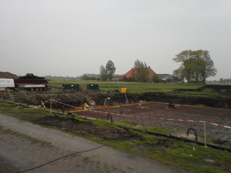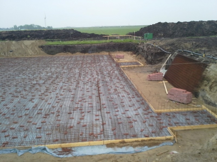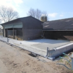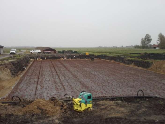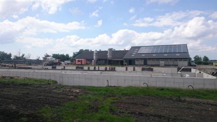 Aannemingsbedrijf Bangma St.Nicolaasga is in april 2015 gestart met een compleet nieuw te bouwen 3+1 ligboxenstal te Sondel. De stal wordt geheel gebouwd volgens Maatlat Duurzame Veehouderij en meet ca. 28,5*55,5 meter. De stal biedt ruimte voor 130 stuks melkvee. Melkwinning d.m.v. 2x 14 zij aan zij. Hiernaast zijn er aparte ruimtes / strohokken voor de te separeren zorgdieren en het afkalven. De stal wordt geheel onderkelderd met maar liefst 2,65 m1 diepe putten. De technische ruimte bevind zich in de machine kelder rondom de melkput. De peilvloeren in de stal worden prefab boxdekken en de emissie-arme vloer van Concrelit type C3. Dit is een hellende vloer voorzien van rubber toplaag met om de 230 cm mestspleten van 40 mm. De staalconstructie thermisch verzinkt, rondom prefab betonwanden met metselwerkmotief, sandwich topgevels (vlak) en sandwich dakpanelen type TR. De nok wordt voorzien van een 3 m1 brede licht-ventilatienok type ellips met zijventilatie. De voorgevel wordt bij de voergang voorzien van een BGS (glas)- deur, en achtergevel schuifdeuren van sandwichpaneel type AV-60, t.p.v. het strohok aan de voorgevel een overheaddeur. Het ventilatiesysteem is het type Safe-System Segment gordijn. Compleet aangestuurd met een klimaatregelaar met MDV functie.