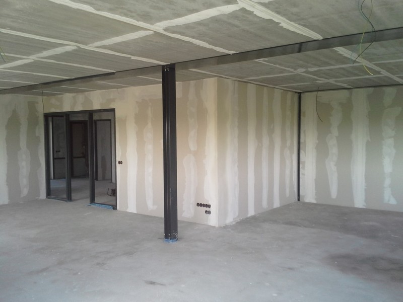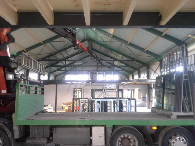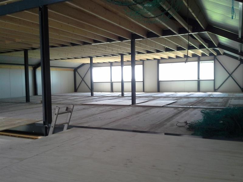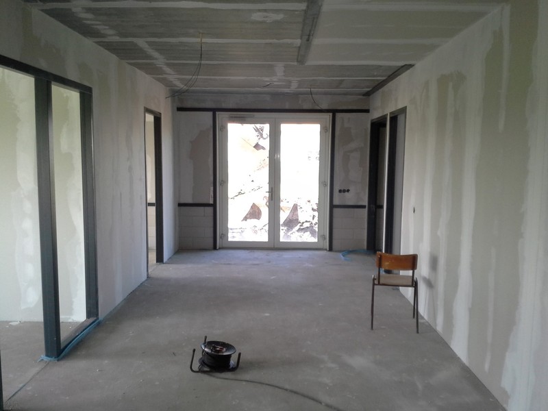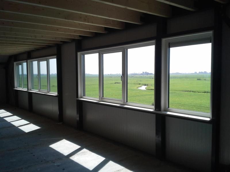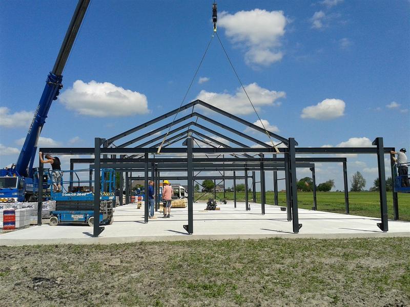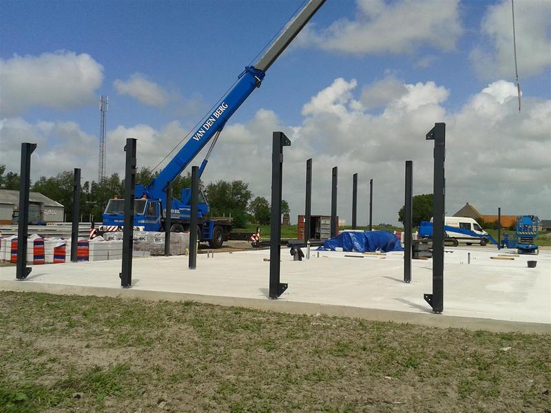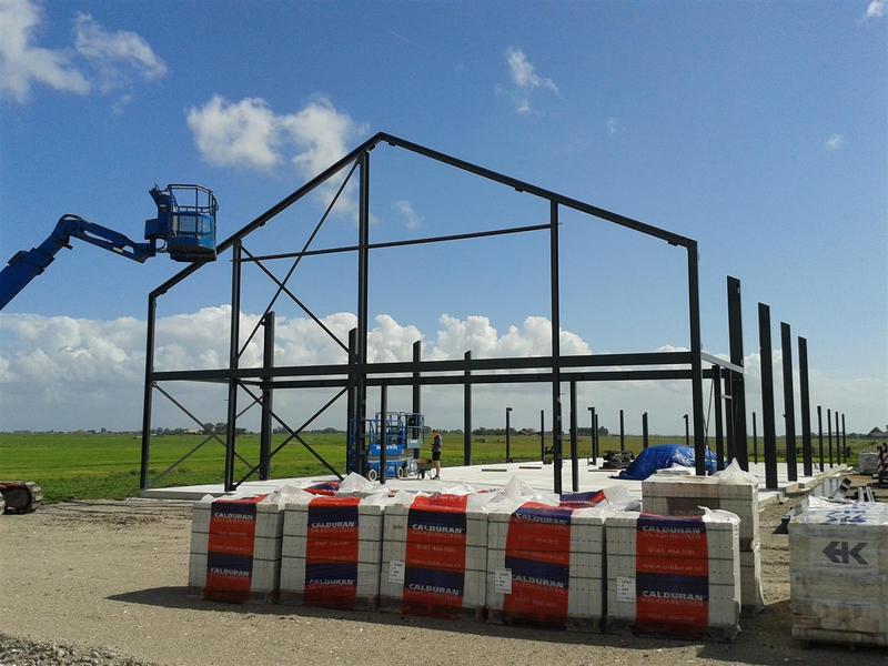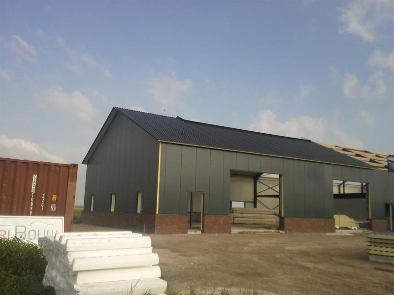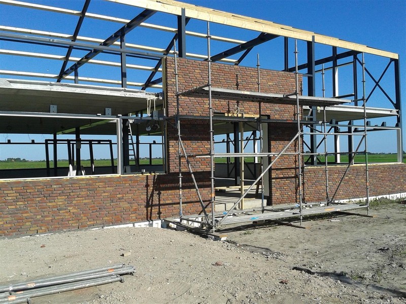 Op de Joodijk 9B is BBT- Agribouw in april 2015 gestart met de nieuwbouw van hun eigen bedrijfspand met inpandig kantoor. Het gebouw meet ca 15*40 m2 waarvan 3 spantvakken op de b.g.g. worden ingedeeld als kantoor. Er wordt direct een betonnen kanaalplaat als verdiepingsvloer gelegd zodat er in de toekomst simpel kan worden uitgebreid als woonbestemming of voor het bedrijf. Van de overige 5 spantvakken in de loods worden de buitenste vakken voorzien van houten zolders. Tussen loods en kantoor een geïsoleerd en brandwerend sandwichpaneel. Het pand wordt geheel onderheid en voorzien van een in het werk gestorte constructievloer. Loods gevlinderd en kantoorvloer aan onderzijde geïsoleerd en aan bovenzijde te voorzien van vloerverwarming. Draagconstructie van stalen spanten gepoedercoat kleur antraciet. Borstwering rondom van spouwmuur. Binnenzijde vellingblokjes, buitenzijde metselwerk bruinrood genuanceerd. Gevels van sandwichpaneel microrib antraciet Rc 4.5. Strakke industriële aluminium kozijnen met zonwerend HR +++ glas kleur antraciet. Goten van getrokken aluminium, dakranden van gezet staal in de kleur donkergrijs. Dak van sandwichpaneel TR – 5 kroons Rc 5.0 kleur zwart. Tevens 2 overheaddeuren 4.5 * 4 m2 met glassecties geheel in bijpassende antracietkleuren. Naast het bedrijfspand aan de noordzijde is nog een kapschuur vergund van 7.5*25 m2 oppervlak. Aan de zuidzijde is nog voldoende ruimte gehouden voor een toekomstige bedrijfswoning.