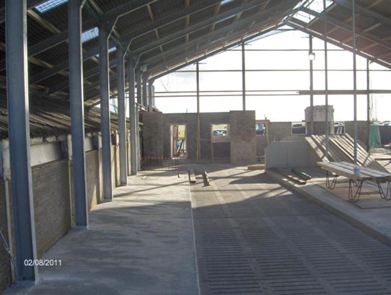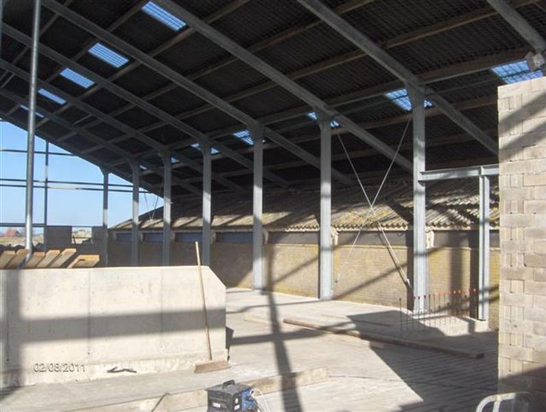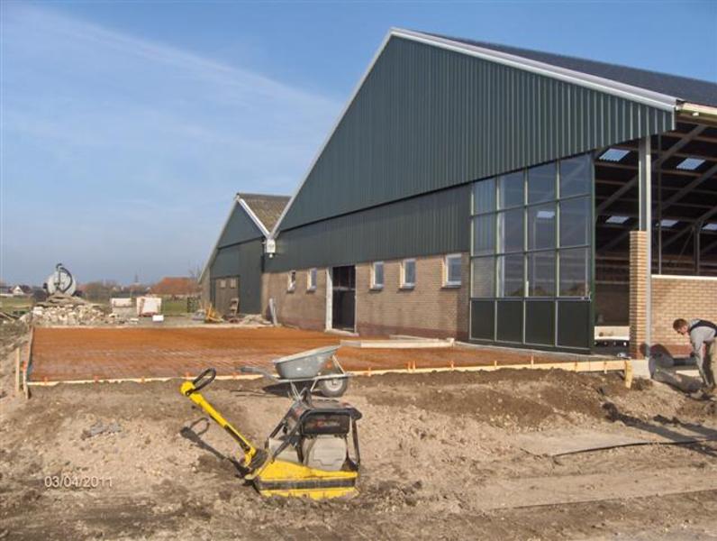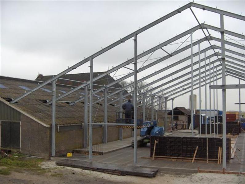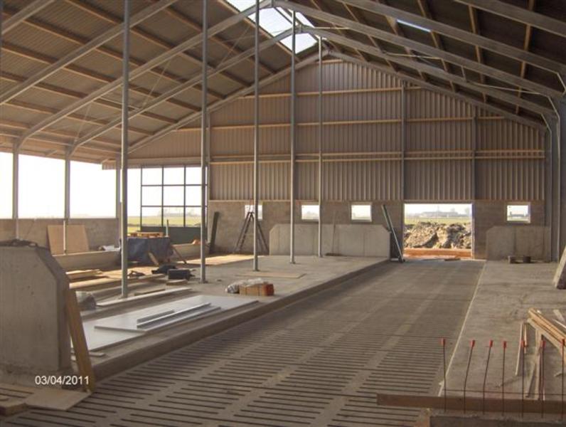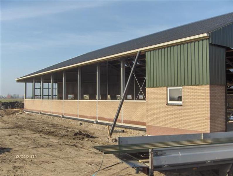 Bovenbouw: thermisch verzinkte spanten, gelijmde betonnen binnenwanden, metselwerk buitenmuren, verduurzaamde houten gordingen, damwand topgevels en Eternit golfplatendak. De nok wordt voorzien van een “Oostra”- oversteek-ventilatie-lichtstraat. Airkoe draagt zorg voor de ventilatiegordijnen. Zodra de nieuwbouw gereed is wordt in de bestaande stal de stalinrichting vervangen en komen er betonwanden onder het voerhek